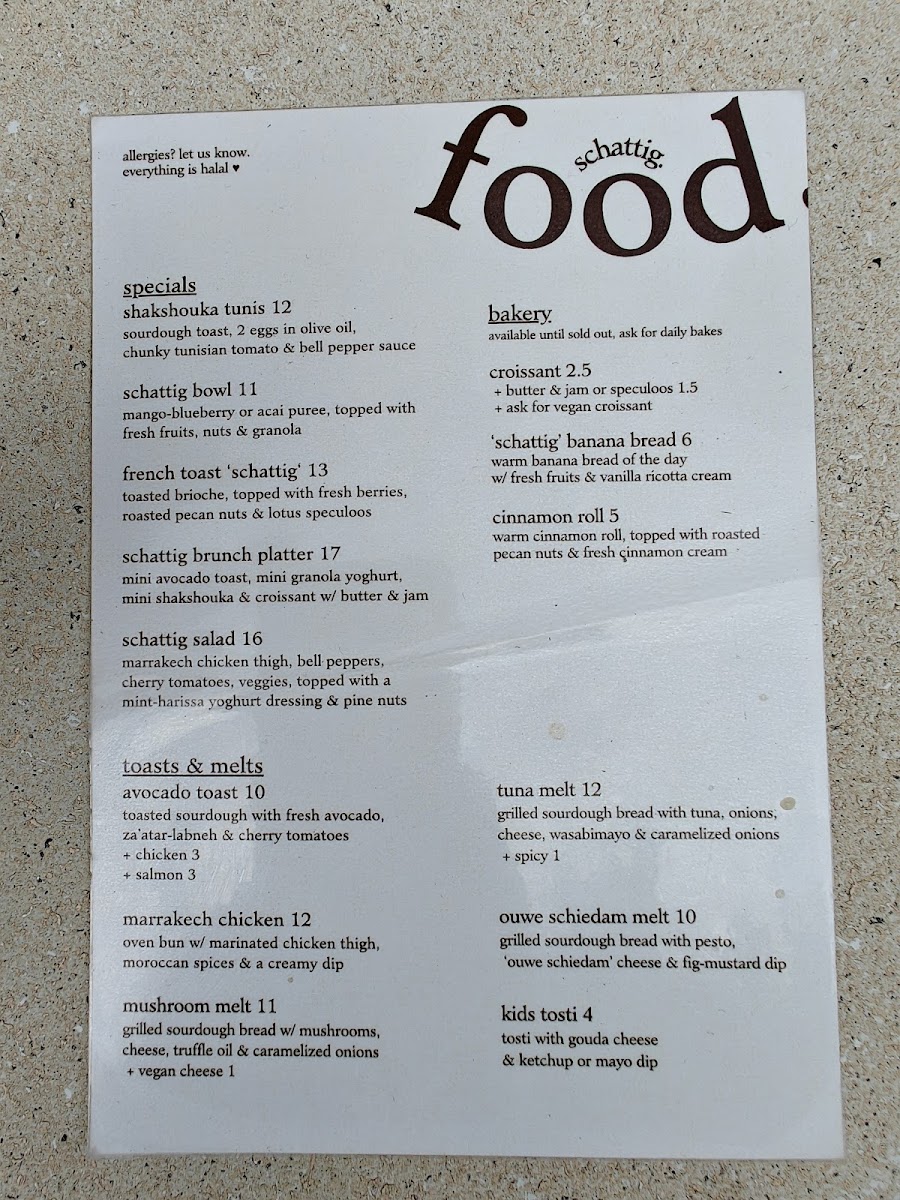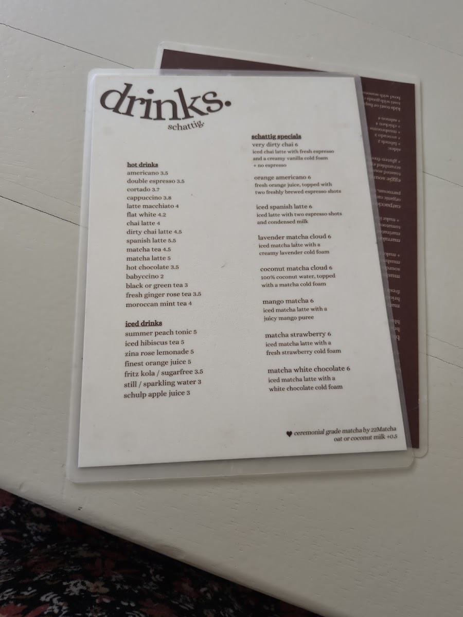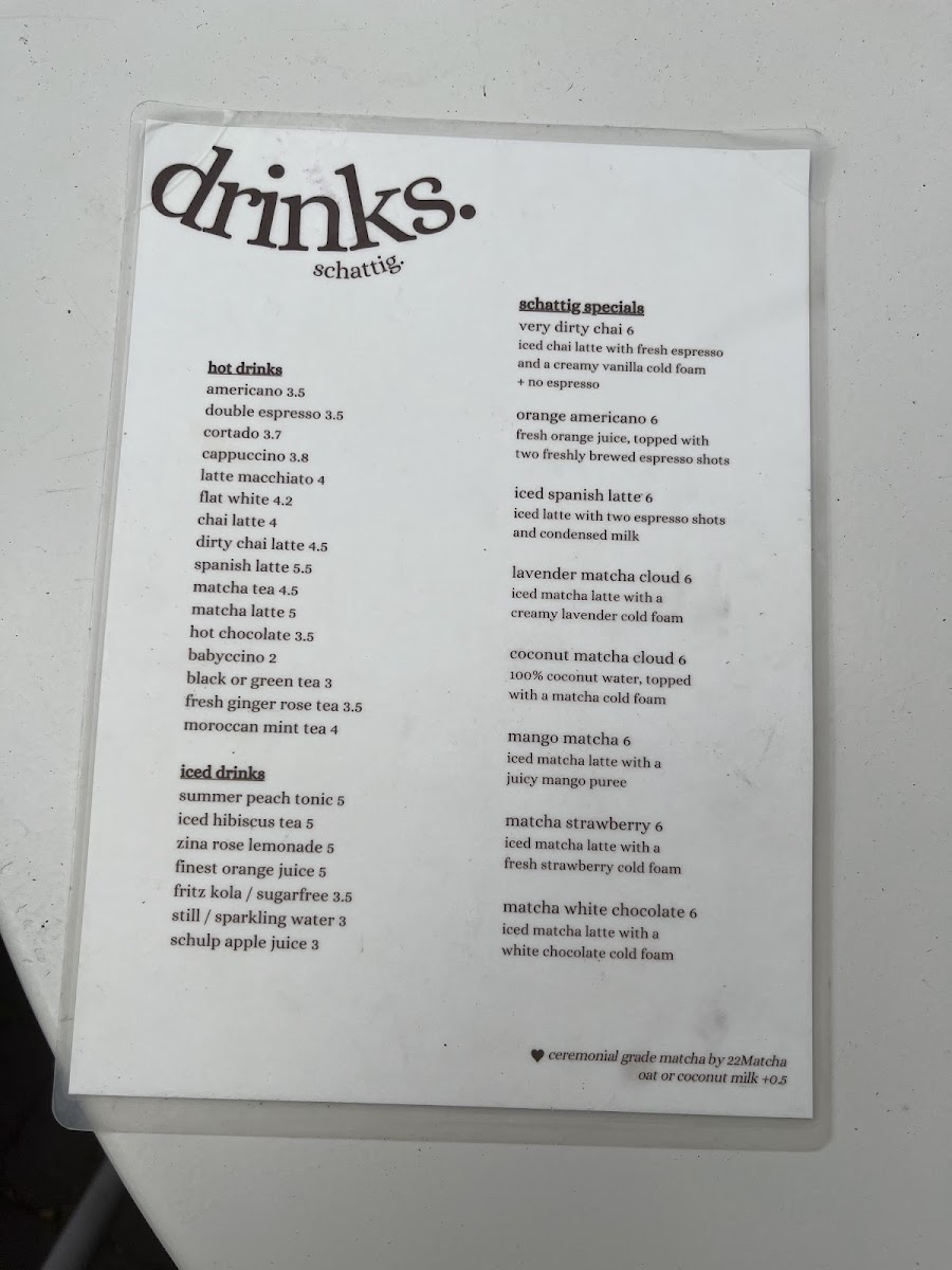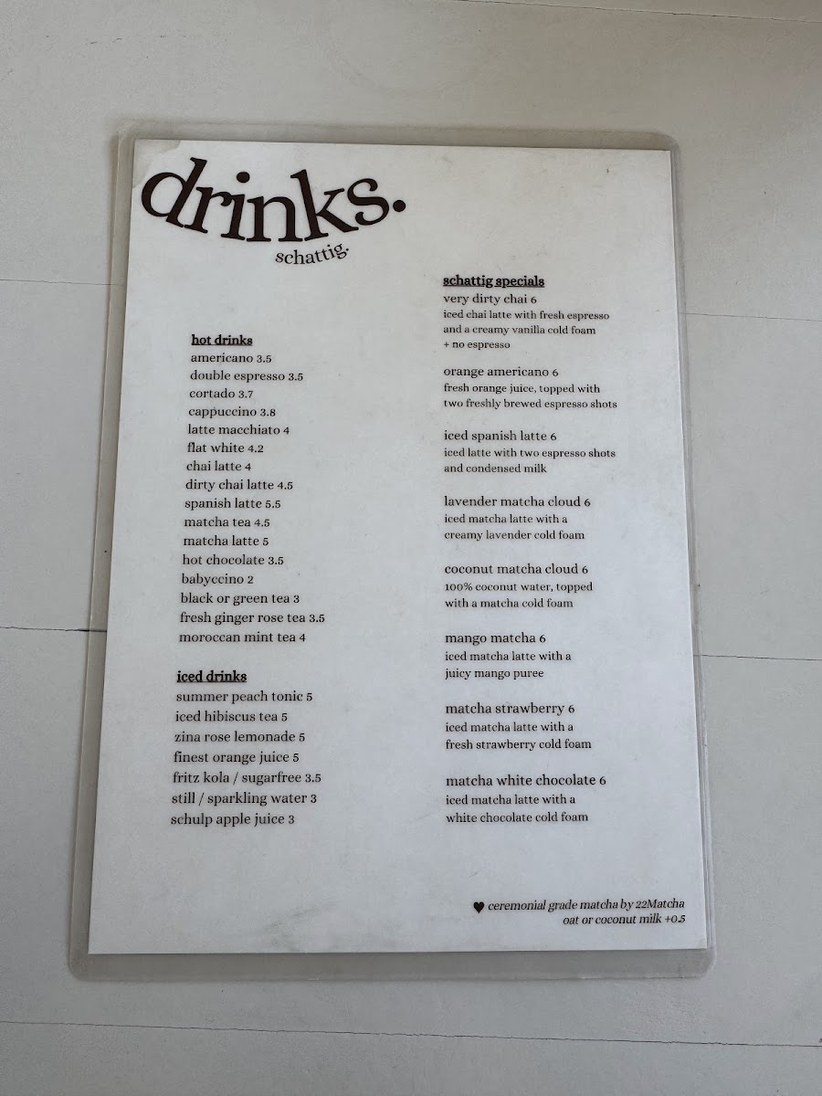 Schattig. offers a thoughtfully curated menu that feels both simple and inviting, perfect for a leisurely coffee break or a relaxed brunch. The selection features a range of comforting drinks alongside casual bites, designed to complement the calm and cozy atmosphere of the café.